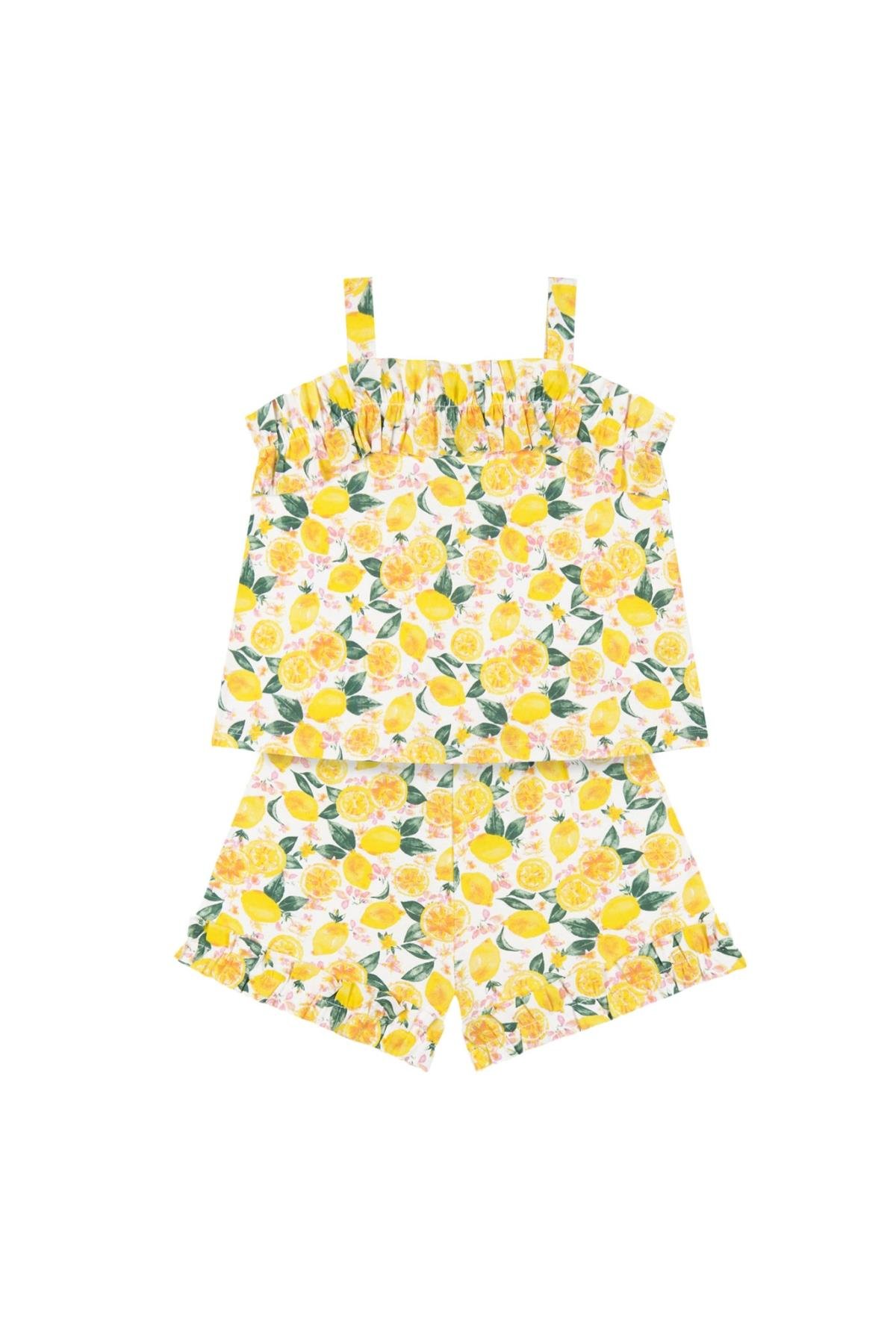 İki parça düz yakalı askılı üst ve elastik bel şort seti. Geniş askılı üstümüz, göğsünde fırfır detaylı olarak tasarlanmıştır ve paça ucunda da fırfırlı şortumuz ile kombinlenmiştir.