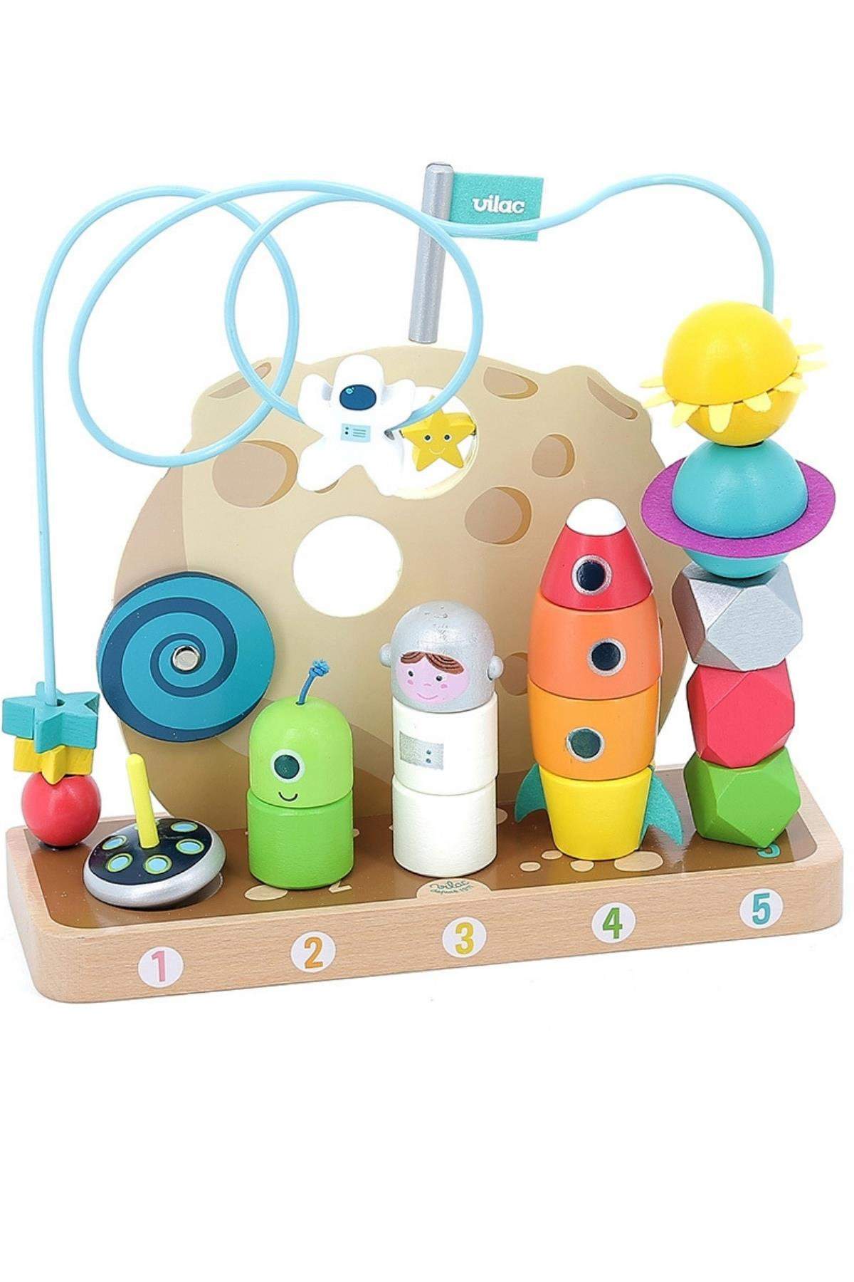 Bu set, galaksiler arası bir top, bir Marslı, bir astronot, bir roket ve istiflenecek ve sayılacak galaksiler içerir. Bir ip üzerinde yönlendirilebilen yıldızlarla donatılmıştır. Ahşap malzemeden yapılmış olan bu oyuncak, motor becerilerini teşvik eder ve çocukların gelişimine yardımcı olur. Bu eğlenceli oyun, 18 ay ve üzeri çocuklar için uygundur.
